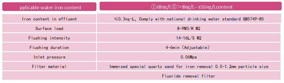 This series of devices are fully automatic operation. From the water inlet, fluorine flushing, water distribution, filtration, backwashing and water outlet, it is combined into an integrated new iron removal device. All can be adjusted automatically according to the operation requirements.