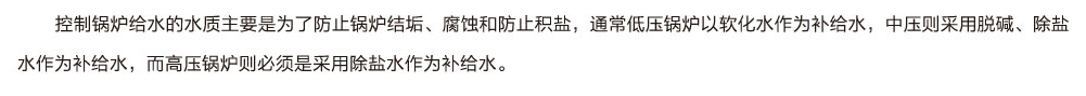 控制锅炉给水的水质主要是为了防止锅炉结垢、腐蚀和防止积盐,通常低压锅炉以软化作为补给水,中压则采用脱碱、除盐水作为补给水,而高压锅炉则必须是采用除盐水作为补给水。
