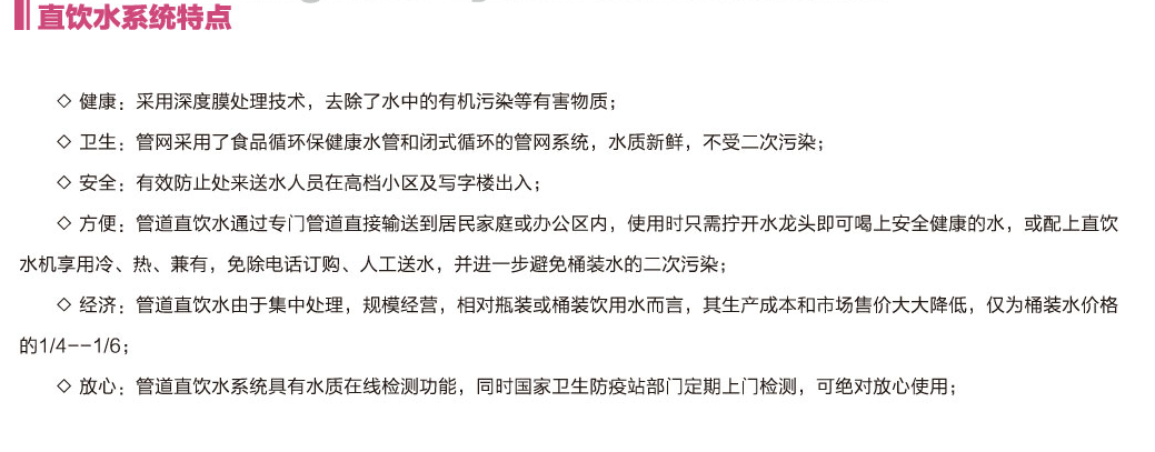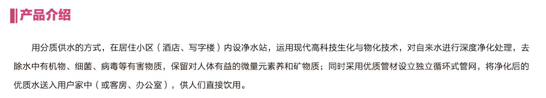 用分质供水的方式,在居住小区(酒店,写字楼)内设净水站,运用现代高科技生化与五华物化技术,对自来水进行深度净化处理,去除水中有机物、细菌、病毒等有害物质,保留对人体有益的微量元素养和矿物质。